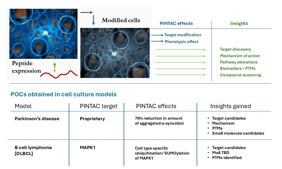 PINTACs are bioactive peptides by definition. They achieve highly selective modification of the intended target when expressed in cells which can be determined in protein preparations from the samples. The type of modification can vary with different targets based on several factors – the nature of the PINTAC-target interaction, their innate proximity in the cell, the cellular compartment in which the interaction occurs, characteristics of the cell type employed in the assay, and so on. On account of its robustness, some PINTAC peptides may give rise to a ‘null’ phenotype with respect to its target, likely by a squelching mechanism. The resulting cells can be employed in drug discovery research as transient ‘knock-outs’ which can further be tuned up or down with molecular biology. In either case, a target-dependent phenotypic effect is consistently observed which is determined with mass spectrometry.