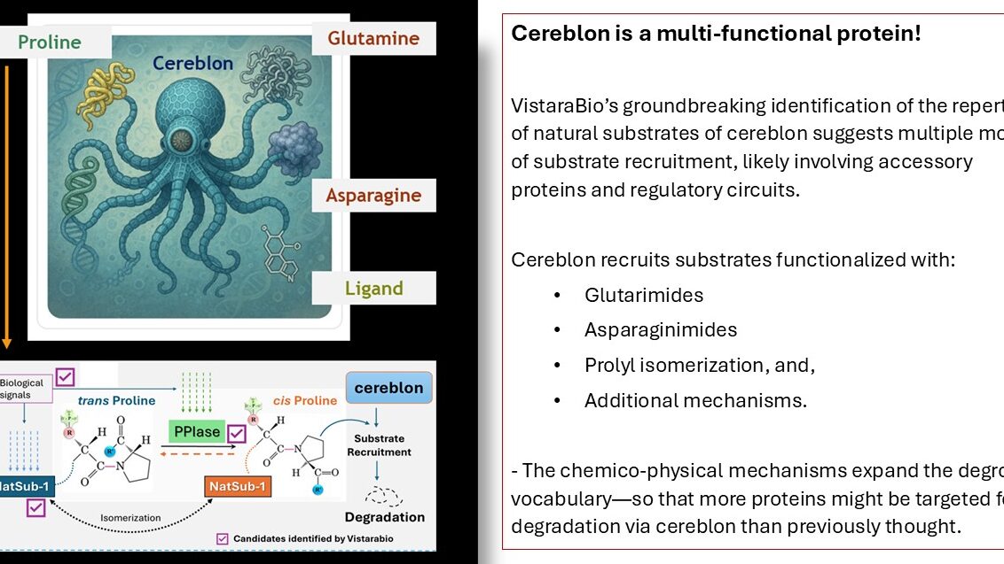 VistaraBio recently identified the repertoire of cereblon’s natural substrates [NatSubs] using its PINTAC process. Ongoing analysis has shown that the NatSubs can be bucketed into multiple subclasses of proteins based on their structures and amino acid signatures. These findings strongly suggest distinct, mutually independent substrate engagement modes by cereblon. The findings will spur highly insightful investigations leading to a better understanding of the roles of cereblon, including in thalidomide-based functions, resistance to the drug, and teratogenicity.