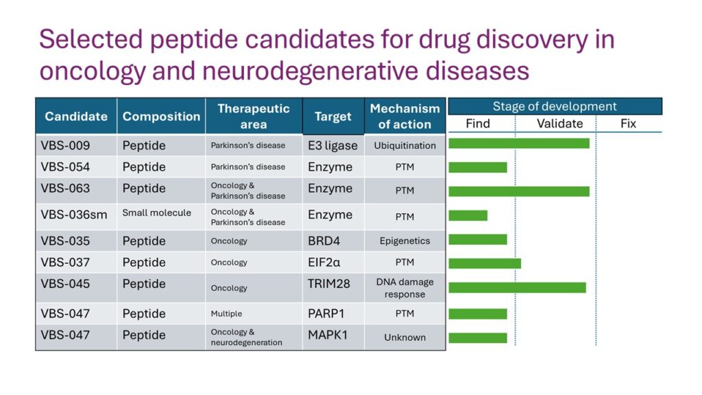 VistaraBio is actively pursuing applying its proprietary bioactive peptides for clinical benefit in oncology and neurodegenerative diseases. The peptides’ mechanism of action is unique – they modify the clinical target via ‘innate proximity’ – which is distinct from ‘induced proximity’ with degraders. So, the peptides work by restoring normal function of the target, rather than via inhibition or degradation.
