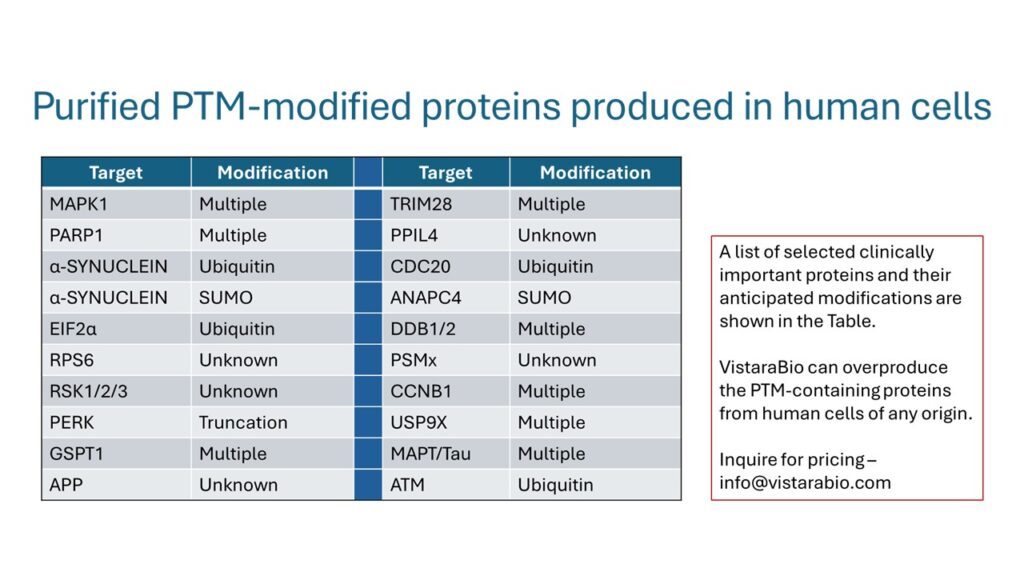 VistaraBio markets purified PTM-containing proteins overproduced in human cells. Over 5,000 PTM containing isoforms of more than 1,500 proteins are currently available. A sample listing is shown in the above table. In more than 50% of the cases the modification and the site of the PTM are known. The remaining are undescribed in literature. Phosphorylation and ubiquitination are the most frequently observed modifications. Additional modifications include acetylation, methylation, ADP-ribosylation, glycosylation, and SUMOylation.